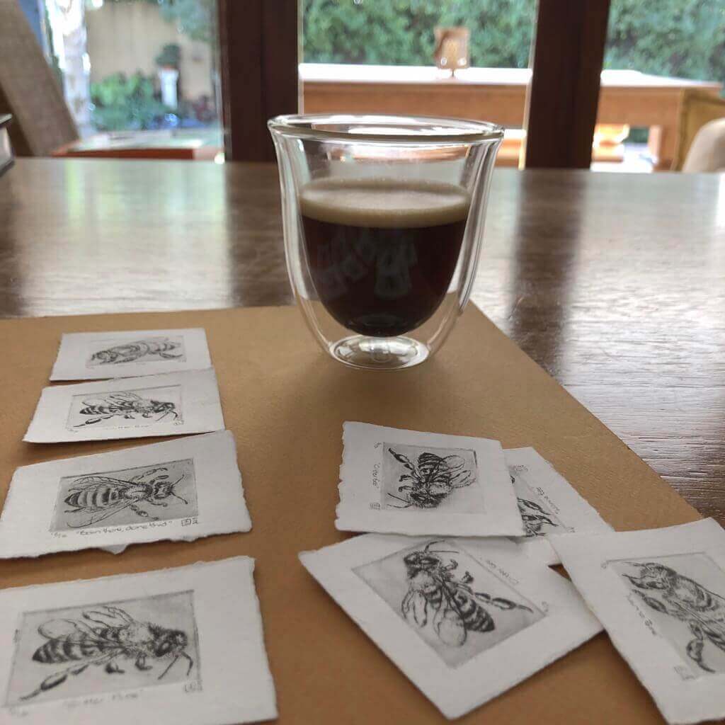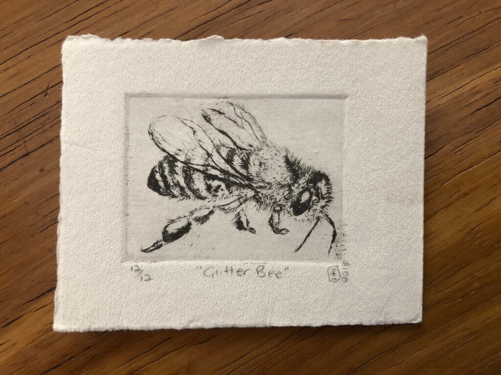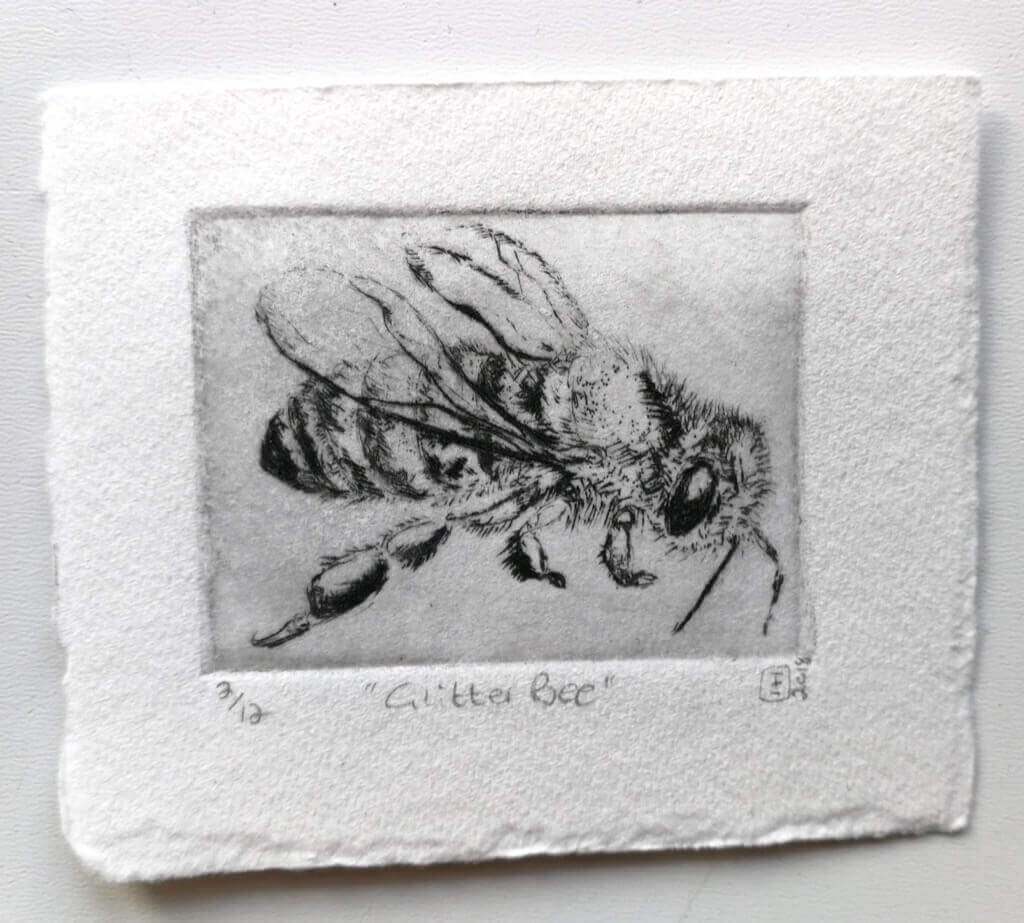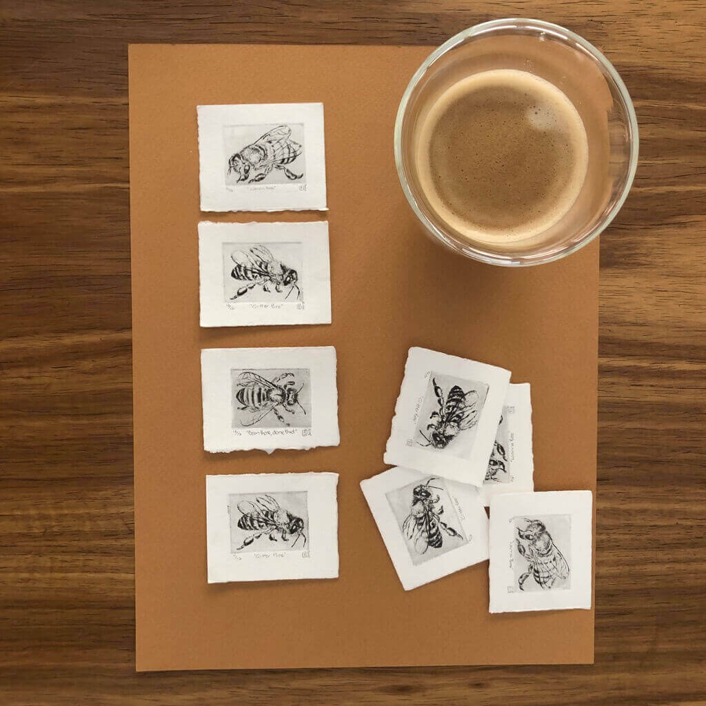 Elizabeth is very fond of miniature artwork with supersized causes. This is her delicate “Bee”-series, highlighting the plight of bees.